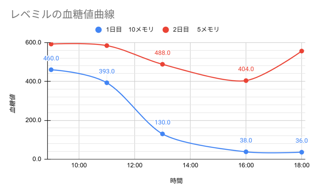 初日に10倍に希釈したレベミルを10メモリ投与して血糖値が38になった時間がありました。そのため夜のインスリンはは5メモリから始めることになりました。